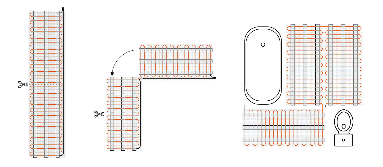 3. Следующим этапом идет укладка нагревательного мата. Перед началом монтажа необходимо выровнять поверхность пола и очистить от мусора. При необходимости можно разрезать фрагменты мата, не затрагивая кабель.
