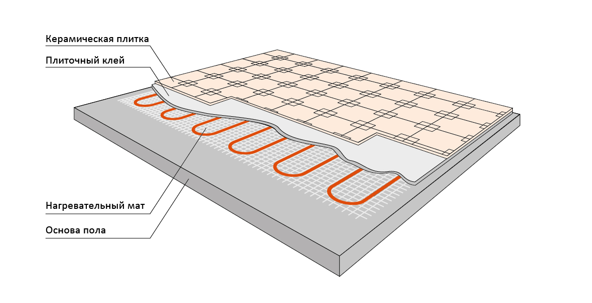 Монтаж нагревательных матов проще, чем кабельного теплого пола — достаточно расстелить на поверхность стяжки и залить клеем, на который впоследствии крепится финишное покрытие.