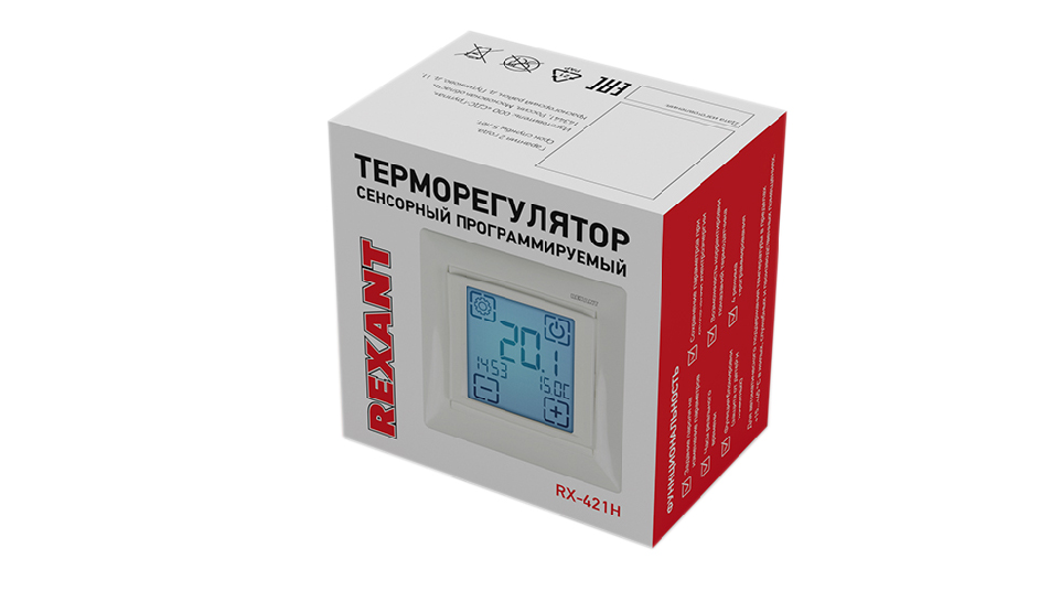 Электронный терморегулятор RX-421H встраиваемый, программируемый по дням недели и часам в сутки, сенсорный экран, корпус белый, диапазон регулировок +15...+45 °C, внешний датчик температуры 10 кОм. Совместим с Legrand серии Valena.